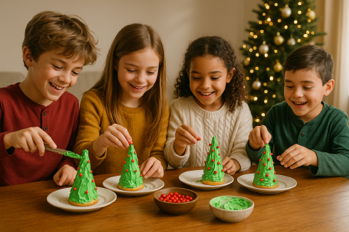 How To Make: Turn the sugar cones upside down and spread the green frosting over the outside of the cones. Apply the white frosting like a garland, and place the red candies on the trees for the ornaments. (Or, make dots with red frosting.) Enjoy!